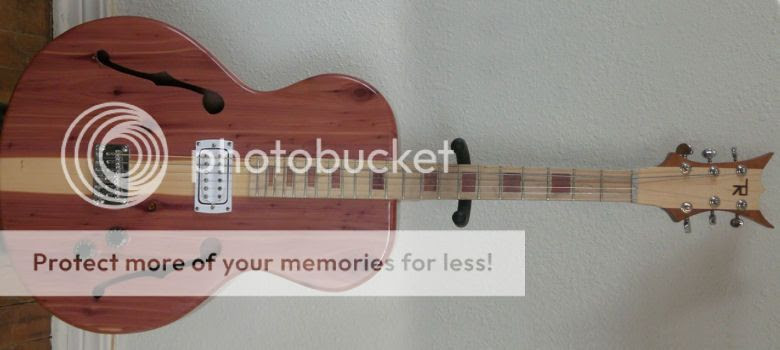 Rincon cuts and mills his own timbers, in this case he's used Eastern Red Cedar for the top, back and sides, and maple for the neck and centre section. I particularly like the choice of timber with knots in it, and the woodworking and finish are of a high quality.